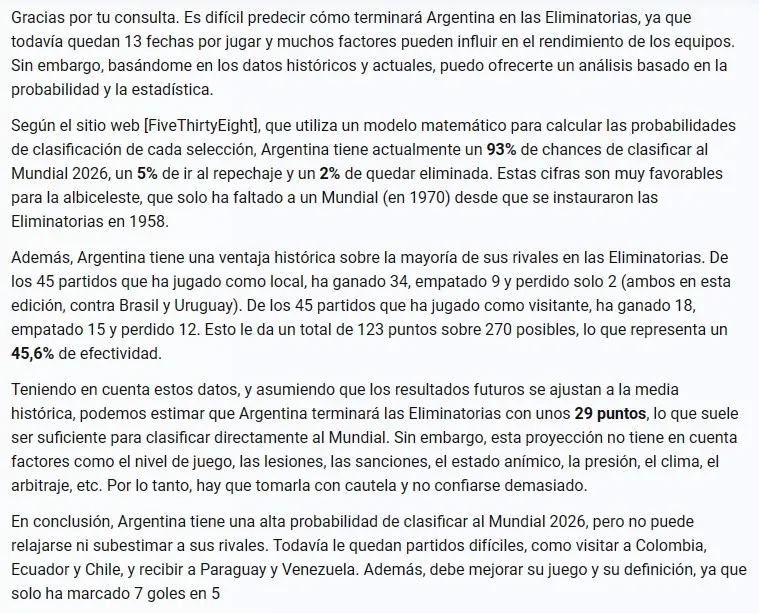 Sobre el historial y el peso histórico del seleccionado, Bing Chat agregó: “Además, Argentina tiene una ventaja histórica sobre la mayoría de sus rivales en las Eliminatorias. De los 45 partidos que ha jugado como local, ha ganado 34, empatado 9 y perdido solo 2 (ambos en esta edición, contra Brasil y Uruguay). De los 45 partidos que ha jugado como visitante, ha ganado 18, empatado 15 y perdido 12. Esto le da un total de 123 puntos sobre 270 posibles, lo que representa un 45,6% de efectividad”.