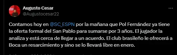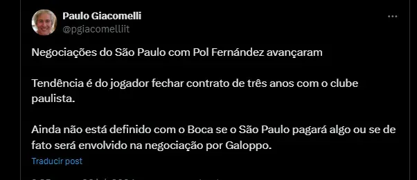 Desde Brasil también insinuan que Pol y San Pablo están muy cerca de llegar a un acuerdo. Fue el periodisa Paulo Giacomelli quien escribió en su cuenta de Twitter: “La tendencia es que el jugador firme un contrato de tres años con el club paulista”.