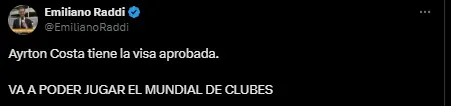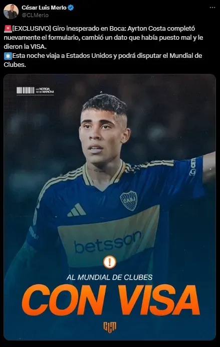 Según reveló el periodista Emiliano Raddi de Planeta Boca Juniors, le aprobaron la visa a Ayrton Costa y podrá jugar el torneo. Había tenido una entrevista en la embajada de Estados Unidos y el panorama parecía complicado, aunque aún no estaba oficializado el rechazo.