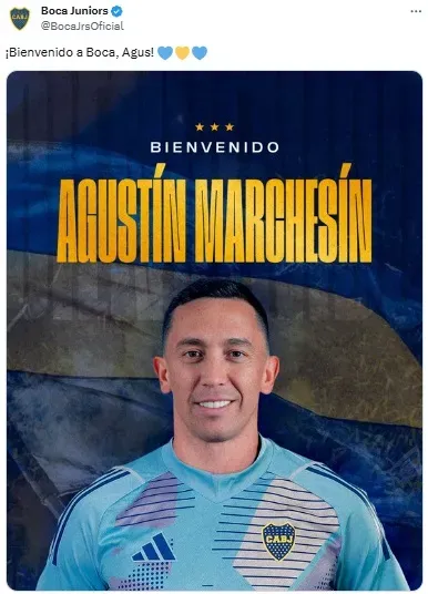 “Hola, acá los saluda Agustín Marchesín. Quiero mandar un saludo muy importante a toda la gente de Boca. Es un privilegio muy grande para mí estar con ustedes y es un sueño de chico. Siempre digo que alcanza sus sueños quién lucha por ellos. Hoy estoy acá persiguiendo este sueño tan importante para mí y para mi familia. Saludo grande y nos vemos pronto”, declaró el flamante arquero.