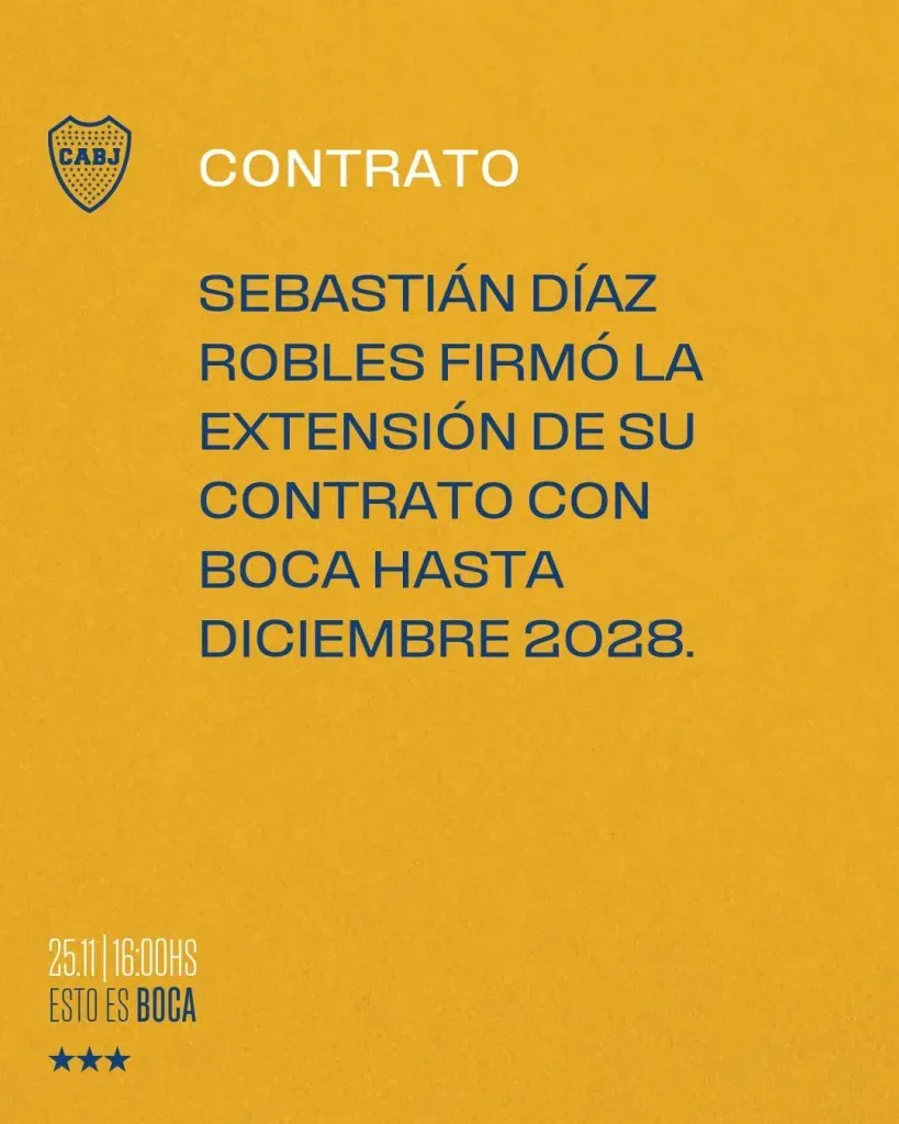 “Sebastián Díaz Robles firmó la extensión de su contrato con Boca hasta diciembre de 2028“, informó el Xeneize a través de su canal oficial de noticias de mercado en redes, Esto es Boca.