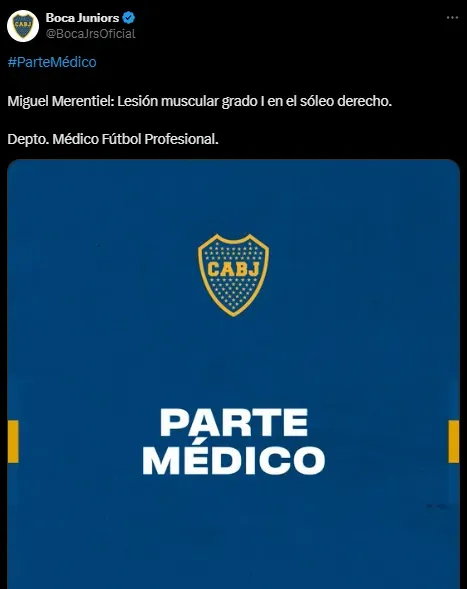 En sus redes sociales, Boca confirmó el grado de la lesión del delantero, mediante la publicación de su parte médico: “Lesión muscular grado I en el sóleo derecho”. Así, Fernando Gago no podrá contar con Miguel Merentiel para las prácticas venideras en esta fecha FIFA, y será baja de mínima para los próximos partidos contra Unión el 20 de noviembre y Huracán el 23 del mismo mes. Lo esperarán hasta último momento para confirmar si podrá estar ante Vélez por la Copa Argentina el 27/11. A priori, parece difícil.
