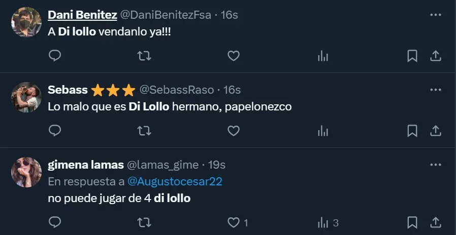 “Lo malo que es Di Lollo hermano, papelonezco”, fue uno de las tantas críticas que surgieron a través de las tribunas virtuales, donde X (ex Twitter) fue la red social en donde hicieron tendencia a nivel nacional al zaguero surgido de Boca Predio. Y las estadísticas de Sofascore argumentaron a los dichos negativos que recibió el futbolista.