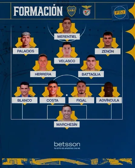 El Xeneize formará con: AgustínMarchesín; LuisAdvíncula, NicolásFigal, Ayrton Costa, LautaroBlanco; AnderHerrera, RodrigoBattaglia; KevinZenón, CarlosPalacios, AlanVelasco; Miguel Merentiel.