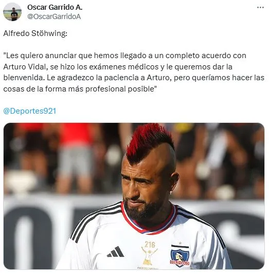 Alfredo Stöhwing, presidente del “Albo”, confirmó que hubo acuerdo con el experimentado futbolista. “Les quiero anunciar que hemos llegado a un completo acuerdo con Arturo Vidal, se hizo los exámenes médicos y le queremos dar la bienvenida. Le agradezco la paciencia a Arturo, pero queríamos hacer las cosas de la forma más profesional posible“, sostuvo.
