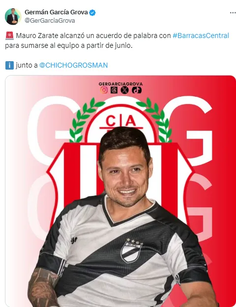 Según contó el periodista Germán García Grova, Zárate será jugador de Barracas Central a partir del 30 de junio, cuando se abra el mercado de pases en Argentina. Y reeditará una delantera que se dio en Boca.