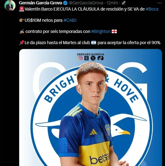 “Van a tratar de negociar y, si Boca no acepta, irán por la cláusula. Ya está el camino allanado y se envió el telegrama para fijar el precio de la cláusula. Hasta el martes, se negocia. Sino, se va por la cláusula. Como sea, el Colo se va de Boca”, expresó el jornalista de TyC Sports en sus redes sociales. El colega Germán García Grova, en paralelo, añadió que el contrato de Barco con Brighton será por seis temporadas.