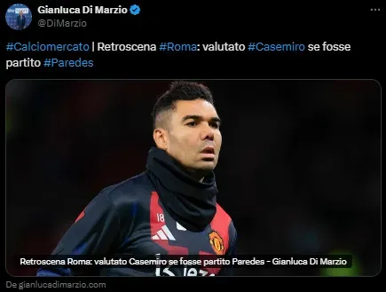 El periodista Gianluca Di Marzio de Calciomercato afirmó que la Roma tiene en carpeta a Casemiro como plan B en caso de que Paredes finalmente deje el club. El volante brasileño del Manchester United supo ser uno de los mejores en su puesto mientras jugaba en el Real Madrid.