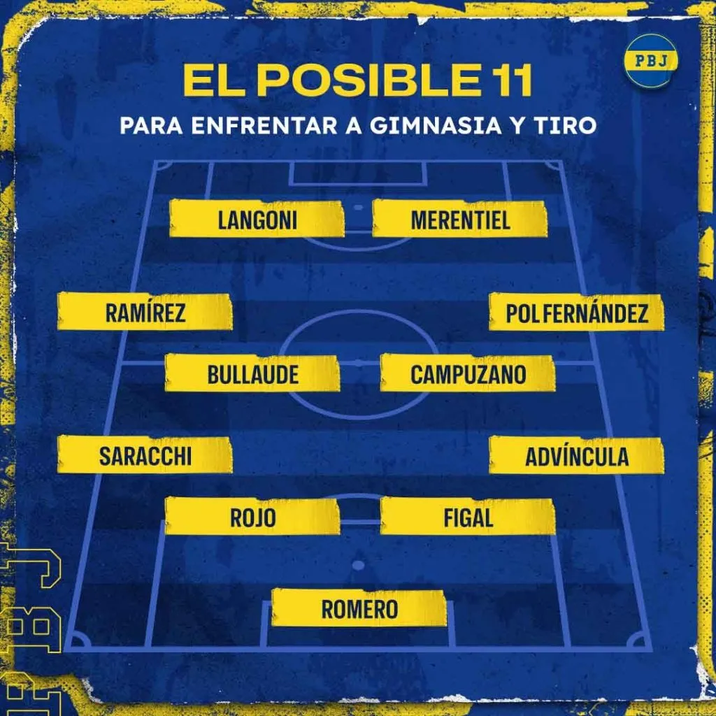 Este viernes, el director técnico de Boca ratificó lo que había probado el jueves. Estos serían los once para el amistoso: Sergio Romero; Luis Advíncula, Nicolás Figal, Marcos Rojo, Marcelo Saracchi; Guillermo “Pol” Fernández, Jorman Campuzano, Ezequiel Bullaude, Juan Ramírez; Miguel Merentiel y Luca Langoni.