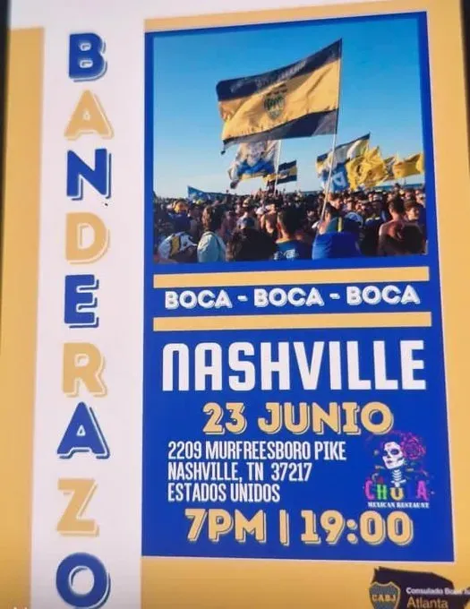 Según informó el Consulado de Boca en Georgia, el banderazo de los hinchas de Boca en Nashville será en las afueras de la ciudad en 2209 Murfreesboro Pike. Y así lo remarcaron: “El banderazo de Nashville será a partir de las 7 de la tarde en el estacionamiento de La Terraza! Entrada Gratis y se puede llevar parillas“.