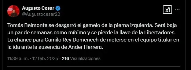 Según reveló el periodista Augusto César, Tomás Belmonte sufrió un desgarro muscular en el gemelo de la pierna izquierda. Y por ende, se perderá varios partidos del Xeneize.