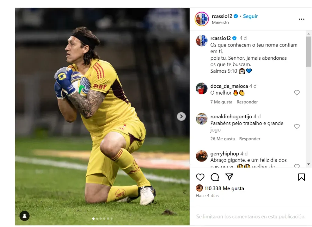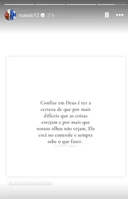 A horas de volver a visitar el Templo, Cassio compartió un mensaje en sus historias: “Confiar en Dios es tener la seguridad de que no importa lo difíciles que sean las cosas y lo que nuestros ojos no puedan ver, él tiene el control y siempre sabe qué hacer”.