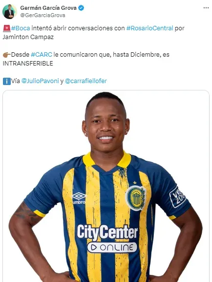 Ante la negativa de Vélez, se abrió una nueva posibilidad, la de Jáminton Campaz. Según la información de Germán García Grova, dirigentes de Rosario Central lo declararon como intransferible para lo que resta del 2024, por lo que a Boca se le cierra una nueva puerta.