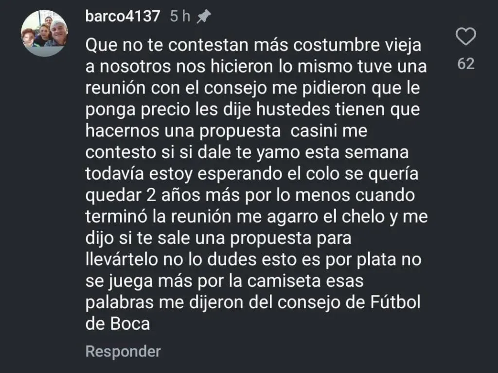 Es que Walter Barco, el padre de Valentín, comentó una publicación de Instagram del usuario @soybosteroo en la que contó detalles sobre las últimas negociaciones de renovación de contrato y el trato que tuvo con integrantes del Consejo del Fútbol como Raúl Cascini y Marcelo Delgado.