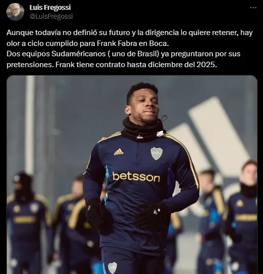 El periodista Luis Fregossi, siguiendo por esta línea, reveló que desde Boca quieren que se quede en el plantel en 2024, pero es una cuestión que parece completamente resuelta. “Aunque todavía no definió su futuro y la dirigencia lo quiere retener, hay olor a ciclo cumplido para Frank Fabra en Boca“, informó el jornalista en sus redes sociales.