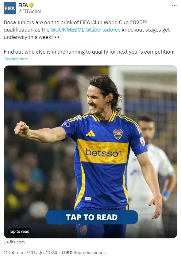 En eso hizo énfasis la FIFA con una publicación en sus cuentas de redes sociales y en su sitio web oficial, tanto en su versión en inglés como en español. Como portada, el organismo utilizó una imagen de Edinson Cavani y dentro de la notificación explicó que, en concreto, Boca precisa que Sao Paulo elimine a Nacional, que River desplace a Tallares y que Atlético Mineiro haga lo propio con San Lorenzo.