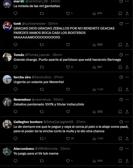 El más elogiado por los hinchas fue Exequiel Zeballos. Tuvo un rendimiento superlativo que incluyó dos grandes jugadas individuales, una para abrir el marcador y otra para que Miguel Merentiel aumentara la ventaja.
