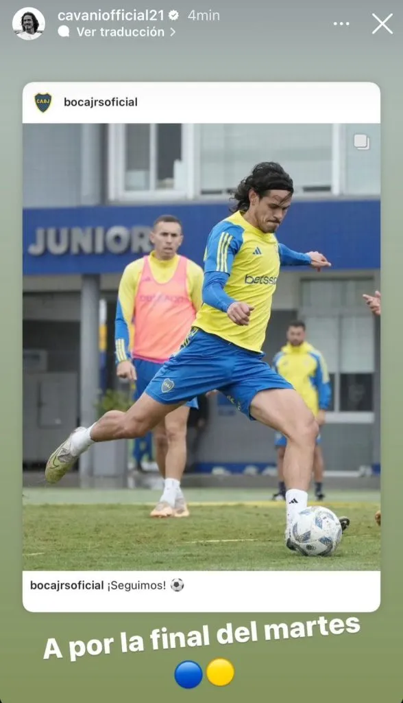 Para este compromiso importantísimo en La Bombonera, Diego Martínez no confirmó el equipo, pero hay algunos puestos que ya están prácticamente confirmados. En el ataque, la presencia de Edinson Cavani es un hecho y en la antesala a este duelo, el Matador utilizó las redes sociales para enviar un mensaje. En su cuenta personal de Instagram, reposteó una publicación de la cuenta oficial del club y confirmó su concentración. “A por la final del martes”, escribió el uruguayo.