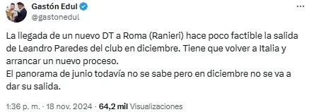 Según la información de Gastón Edul, la llegada de Claudio Ranieri a la Roma son una piedra en el camino para el Xeneize. “Hace poco factible la salida de Leandro Paredes del club en diciembre. Tiene que volver a Italia y arrancar un nuevo proceso”, explicó el periodista.