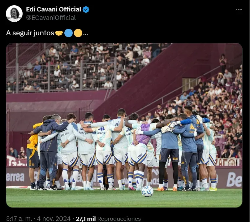 El uruguayo se mostró activo en las redes sociales varias horas después del encuentro en el sur del Gran Buenos Aires y realizó un posteo en sus cuentas en plena madrugada. Alrededor de las 3 AM, Cavani publicó una foto de todo el plantel de Boca reunido en el césped del estadio de Lanús y escribió un firme “a seguir juntos”.