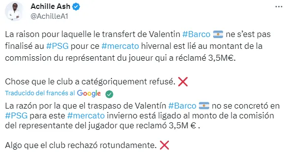 Según develó el periodista francés Achille Ash, el Paris Saint-Germain no avanzó por Barco debido a su representante. Y es que este último le había pedido al club francés una comisión de 3.5 millones de euros por concretar la venta. Desde el conjunto europeo, rechazaron rotundamente esta solicitud y las negociaciones se dieron por finalizadas.