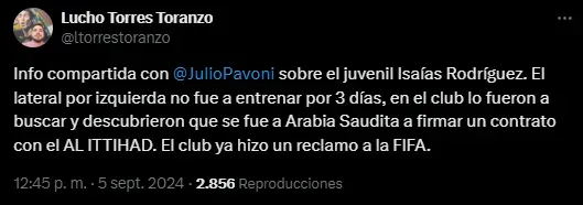 El periodista Luciano Torres Toranzo contó en X (ex Twitter) el panorama del drama que tiene a Boca, Al Ittihad y a Isaías Rodríguez como protagonistas. Siendo categoría 2005, el lateral es mayor de edad, por lo que no puede marcharse por la patria potestad. Sin embargo, el juvenil partió a Arabia Saudita debido a que no posee contrato profesional con el Xeneize, por lo que emigró por su cuenta y firmó un vínculo con el club árabe.