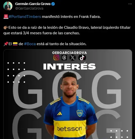 Así, luego de 8 temporadas y 224 partidos disputados en el Xeneize, el ciclo del colombiano en Brandsen 805 podría llegar a su fin tras este interés concreto desde la MLS, ya que incluso el propio jornalista que dio la noticia manifestó que existe la chance que Fabra quiera emigrar de Boca.