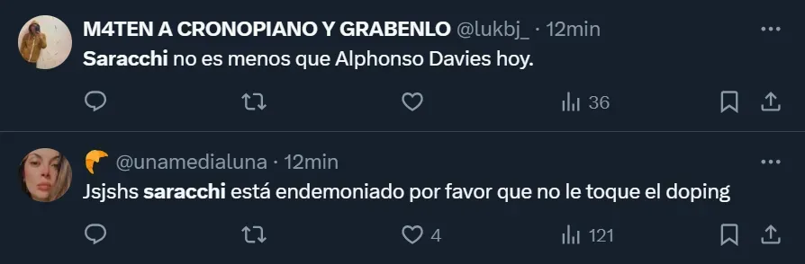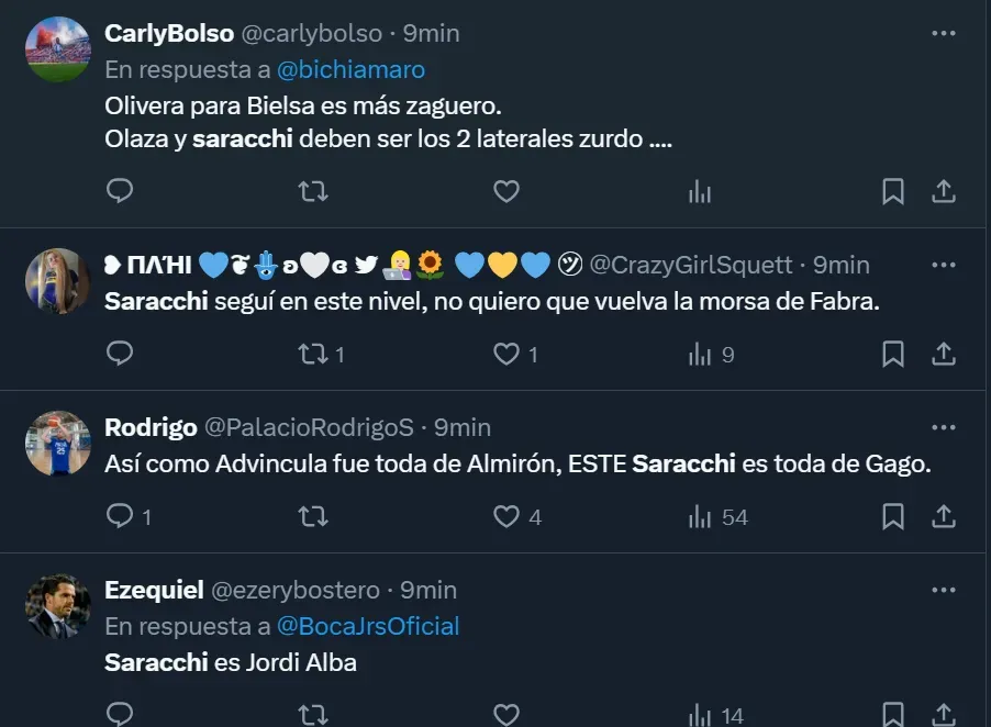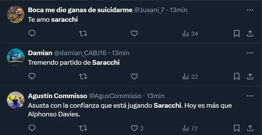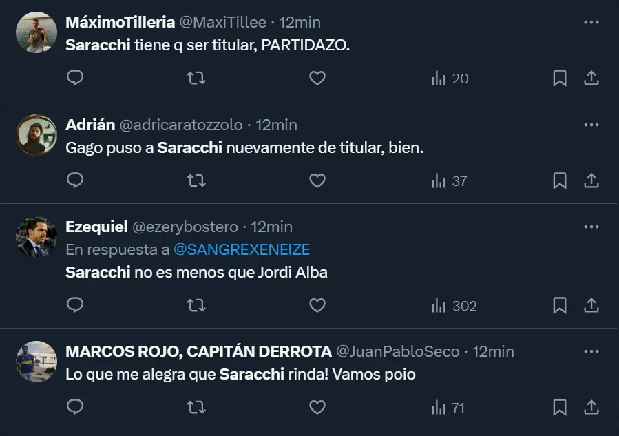 Según la óptica de los simpatizantes que se expresaron en Twitter, el mejor futbolista de Boca fue el uruguayo Saracchi, quien no solo convirtió el tercer tanto, sino que también tuvo un gran despliegue, jugó con muchísimo criterio y se subió al ring para pelear con Lautaro Blanco por la titularidad en el lateral izquierdo. Incluso, lo pidieron para la selección charrúa que dirige Marcelo Bielsa.