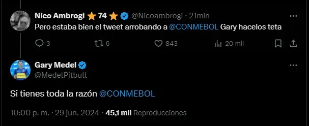 Luego, un usuario de X le sugirió que “estaba bien arrobando a CONMEBOL“. Esto es en alusión a que mencionó en primer lugar a la Confederación Sudamericana de Fútbol y este era el tuit original: “Y este robo @CONMEBOL. Va dos expulsiones claras y nos siguen cagando”. Sin embargo, el chileno redobló la apuesta y le contestó arrobando nuevamente el ente más importante: “Sí, tienes toda la razón“.