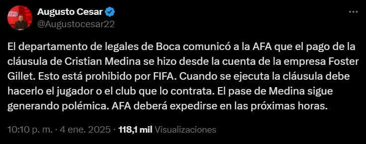 “El departamento de legales de Boca comunicó a la AFA que el pago de la cláusula de Cristian Medina se hizo desde la cuenta de la empresa Foster Gillet. Esto está prohibido por FIFA. Cuando se ejecuta la cláusula debe hacerlo el jugador o el club que lo contrata. El pase de Medina sigue generando polémica. AFA deberá expedirse en las próximas horas”, comentó Augusto César en su cuenta de X.