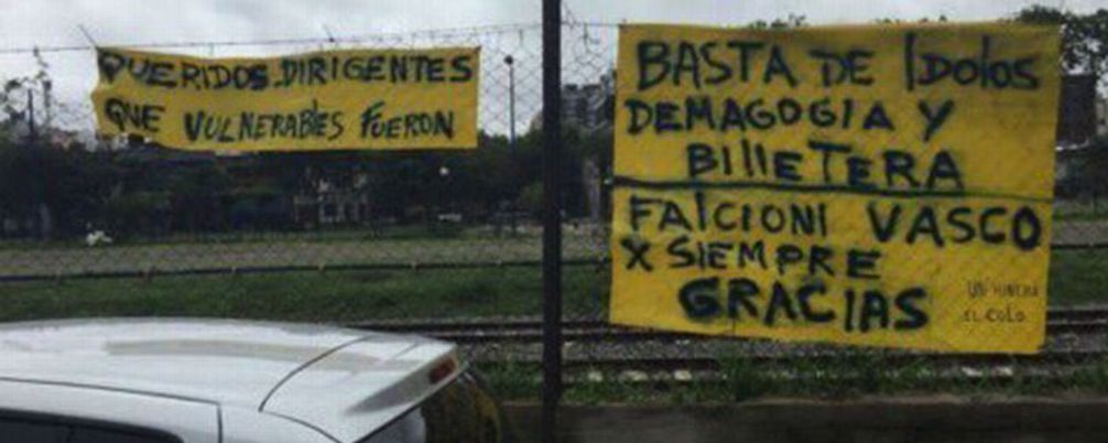 'Queridos dirigentes, que vulnerables fueron', rezaba el trapo más chico, en tanto que el más grande defendía puntualmente al Vasco Arruabarrena y a Julio César Falcioni. Basta de ídolos, demagogia y billetera. Falcioni y Vasco por siempre, gracias', decía.