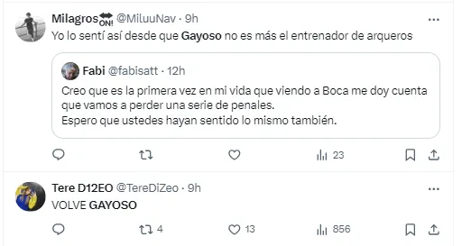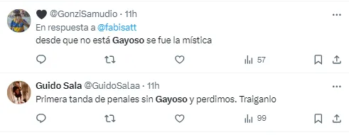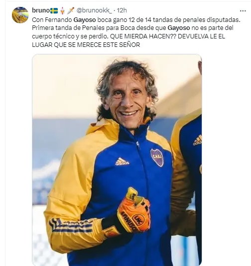Gayoso ganó mucho protagonismo entre 2022 y 2023, con las grandísimas rachas de Agustín Rossi y Sergio Romero en los penales. Sobre todo en la Copa Libertadores 2023, cuando el Xeneize pasó todas las fases definitorias en la definición desde los doce pases.