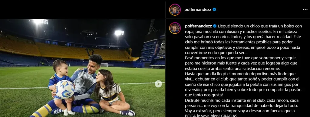 Luego de haber afrontado el último compromiso en el club de la Ribera, Pol Fernández se quedó en el césped de Brandsen 805 con sus hijos, para poder despedirse a solas del lugar donde pasó la mayor parte de su carrera. Tras esto, ya entrado el domingo, el santafecino hizo un posteo en sus redes sociales para dar un último adiós a los hinchas de Boca.