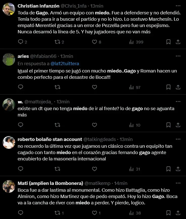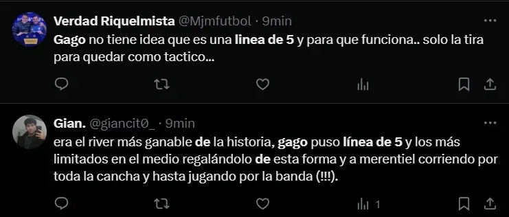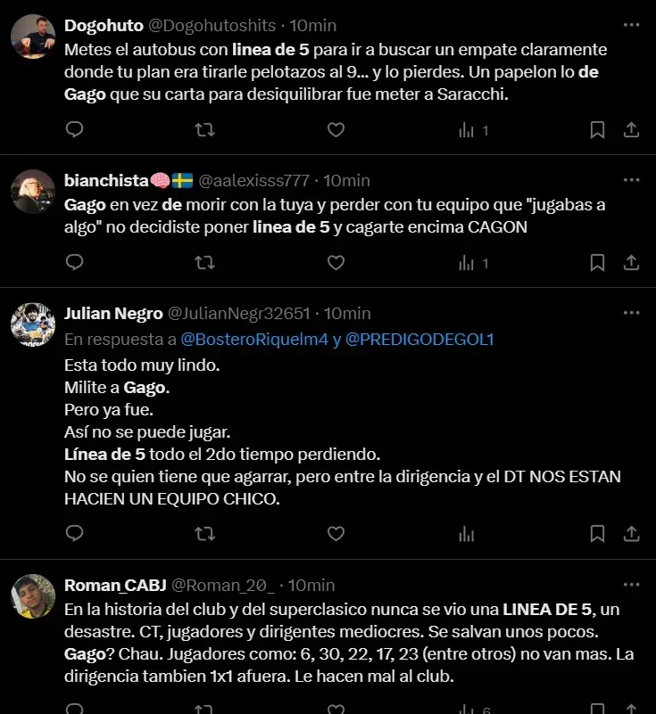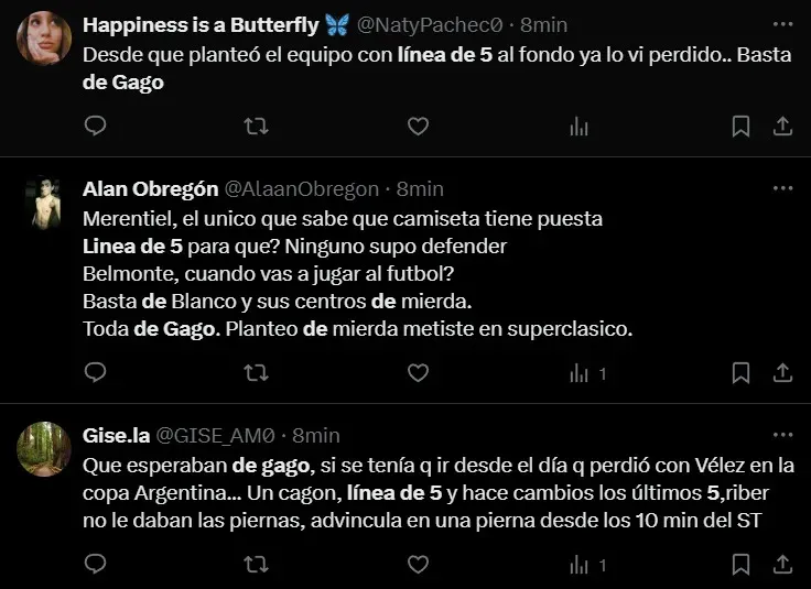 “Toda de Gago, armó un equipo con miedo“, escribió un simpatizante en X (Twitter) molesto por el mal funcionamiento del equipo. “Desde que planteó el equipo con línea de 5 al fondo, ya lo vi perdido. Basta de Gago“, posteó otro hincha, pidiendo el fin del ciclo de Pintita.