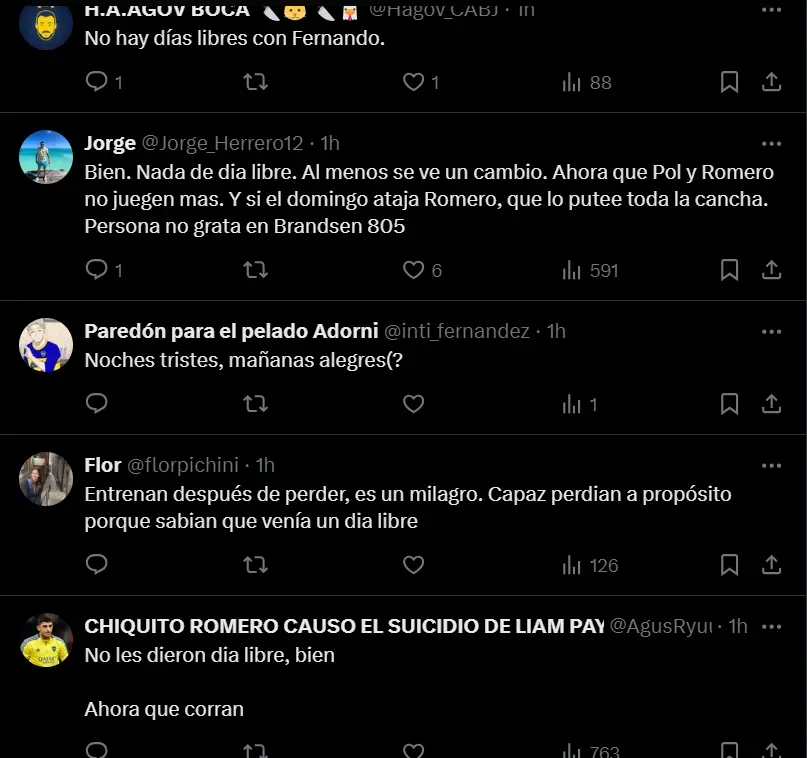 Aún con disgusto por la derrota sufrida ante Tigre, los hinchas de Boca celebraron que se haya cambiado el enfoque de los entrenamientos y se les dé jornada de trabajo luego del partido disputado que terminó en derrota por 3 a 0. Frases como “no hay días libres con Fernando”, “noches tristes, mañanas alegres” o incluso “entrenan después de perder, es un milagro” fueron algunas que se alcanzaron a leer entre los fanáticos xeneizes. Otros, fueron incluso más contundentes: “Que no vuelvan a tener el día libre hasta que se den cuenta el escudo que están representando“, soltaron entre los comentarios.