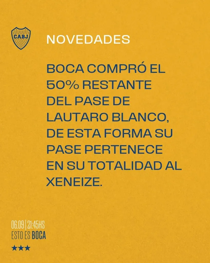Es que a través de la cuenta de redes sociales Esto es Boca (en X @estoesboca_ok), donde publica todo lo relacionado con el fútbol y el mercado de pases, confirmó que adquirió la parte que le quedaba sin comprar de la ficha de Blanco.