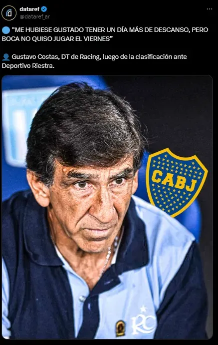 Al terminar el encuentro, Gustavo Costas habló en conferencia de prensa y tuvo una insólita queja sobre el duelo ante el Xeneize: “Me hubiese gustado tener un día más de descanso, pero Boca no quiso jugar el viernes“.