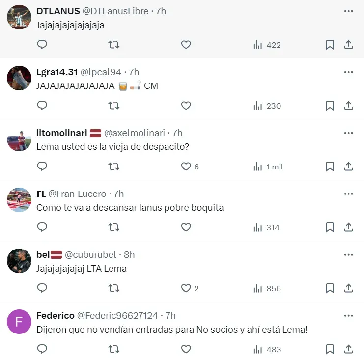 Entre las postales que compartió Lanús aparecía de fondo Cristian Lema y muchos de los comentarios de la publicación eran sobre él. Los hinchas del Granate se burlaban de su performance y algunos afirmaban que fue un espectador de lujo en los dos tantos del conjunto del Sur.