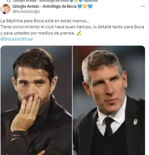 “La Séptima para Boca está en estas manos… Tiene conocimiento el club hace buen tiempo, lo detallé tanto para Boca y para ustedes por medios de prensa”, posteó el astrólogo, junto a fotos de Fernando Gago y Martín Palermo, explicando que deben ser los entrenadores para ganar el certamen continental.