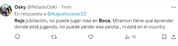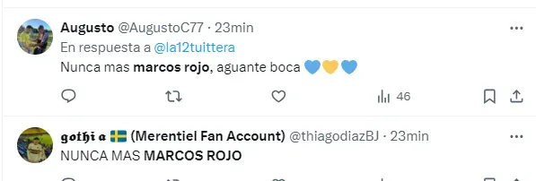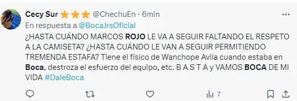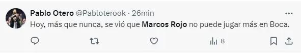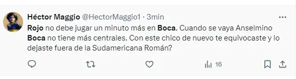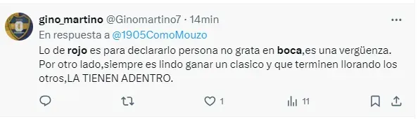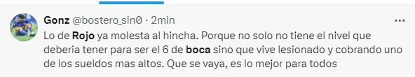 “Nunca más Rojo en Boca”, “Lo de Rojo ya molesta al hincha”, “Que se vaya, es lo mejor para todos”, “Rojo no debe jugar un minuto más en Boca”, “Lo de Rojo es para declararlo persona no grata en Boca”, “Basta de Rojo”, fueron algunos de los comentarios de los hinchas del Xeneize contra el capitán.