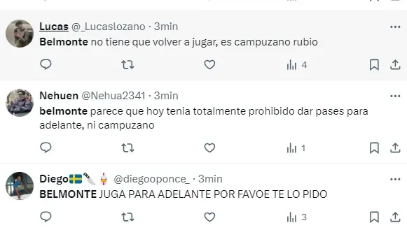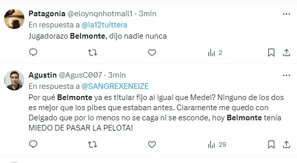 “¿A Belmonte le da vértigo pasarla para adelante o que?”, “Belmonte flojo”, “Belmonte es horrible”, “Que flojito Belmonte”, “Belmonte no es más que Campuzano”, “Belmonte, a los de azul, te lo pido de rodillas”, fueron algunos de los comentarios de los hinchas criticando al volante.