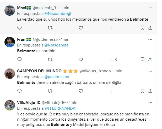 Debido a este mal resultado que obtuvo el equipo dirigido por Diego Martínez, los hinchas del Xeneize se mostraron inconformes en las redes sociales, donde criticaron el rendimiento de algunos futbolistas, y uno de los principales apuntados fue uno de los refuerzos, como lo es Tomás Belmonte.