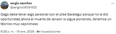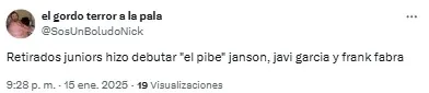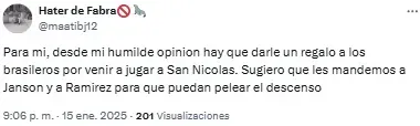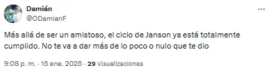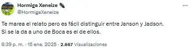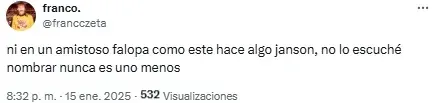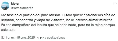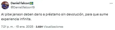 “No lo escuché nombrar nunca. Es uno menos”, lanzó como crítica uno de los hinchas durante el partido. Otro, en cambio, analizó: “Cambiar a Janson por Palacios es como pasar del auto de Pedro Picapiedra al Alpine de Colapinto”.