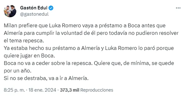 El periodista Gastón Edul reveló que, tras las últimas conversaciones entre Boca y Milan, hay conflicto entre los clubes por la cláusula de repesca de Luka Romero. En concreto, el “Rossonero” desea tener la posibilidad de pedirlo de vuelta dentro de seis meses, pero el Xeneize no acepta esa chance.