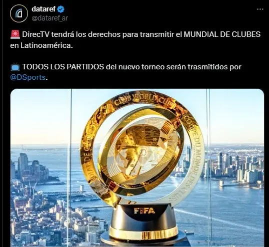 Según revelaron en Yahoo!News, DirecTV tendrá los derechos televisivos para el Mundial de Clubes 2025. Y por ende, trasmitirá todos los partidos del torneo FIFA en Latinoamérica.Así lo explicó Reuters Emilio Rubio, director de Contenidos de Vrio Corp, empresa encargada de administrar DirecTV: “La estrategia deportiva es uno de los pilares fundamentales de la estrategia de contenido y distribución de nuestro negocio y este evento nos consolida una vez más como líder de lo que es el segmento deportivo“.