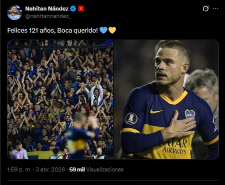 “Felices 121 años, Boca querido“, escribió Nahitan Nández en su cuenta oficial de X (Twitter). Los hinchas del Xeneize estallaron de felicidad y empezaron a pedirle por su regreso, cuyo rumor empezó a hacerse cada vez más fuerte en las últimas semanas pensando en el mercado de pases de junio.
