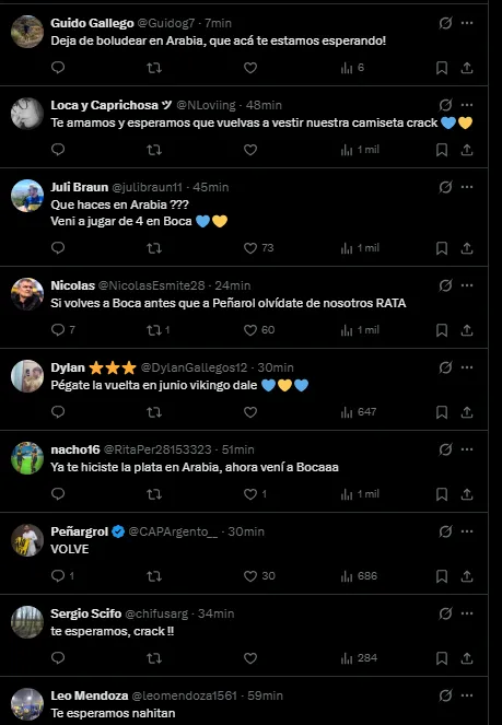 “Acá te estamos esperando”, “Vení a jugar a Boca”, “Volvé”, “Te esperamos, crack”, fueron algunos de los comentarios de los fanáticos en respuesta al tuit. El uruguayo está jugando en Al Qadisiya de Arabia Saudita y tiene contrato hasta mediados de 2027.