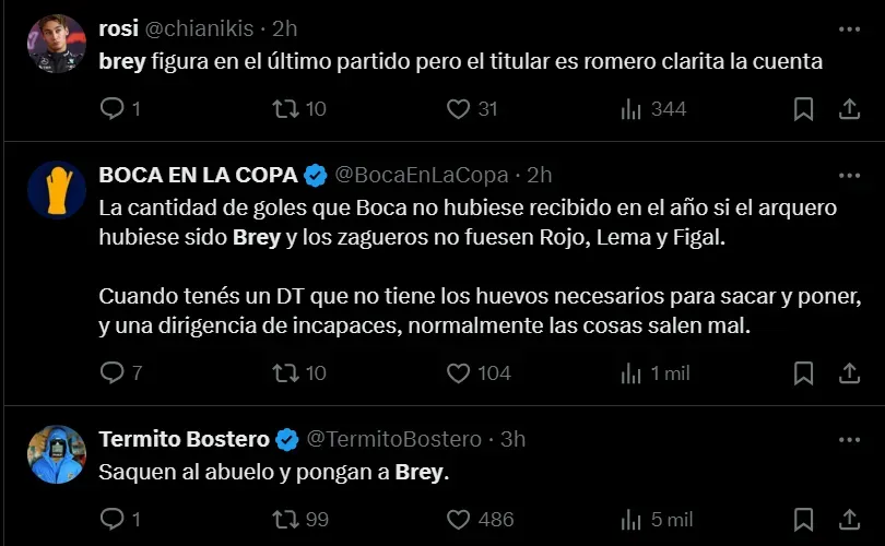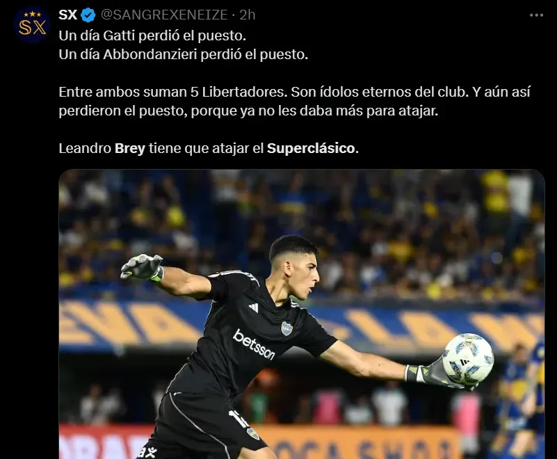 Por ese motivo, quien también fue viral entre el público virtual xeneize fue Leandro Brey, ya que el joven arquero que ha tenido grandes actuaciones bajo los tres palos es pretendido por los hinchas para que sea el golero titular ante River el próximo fin de semana.
