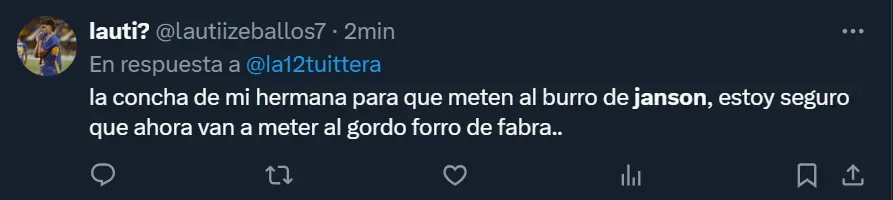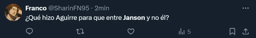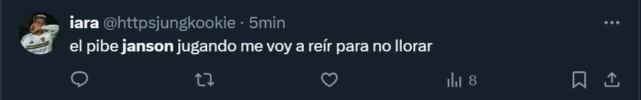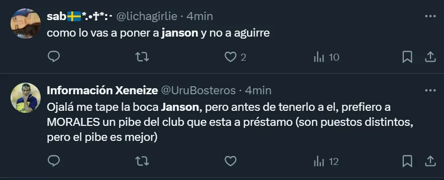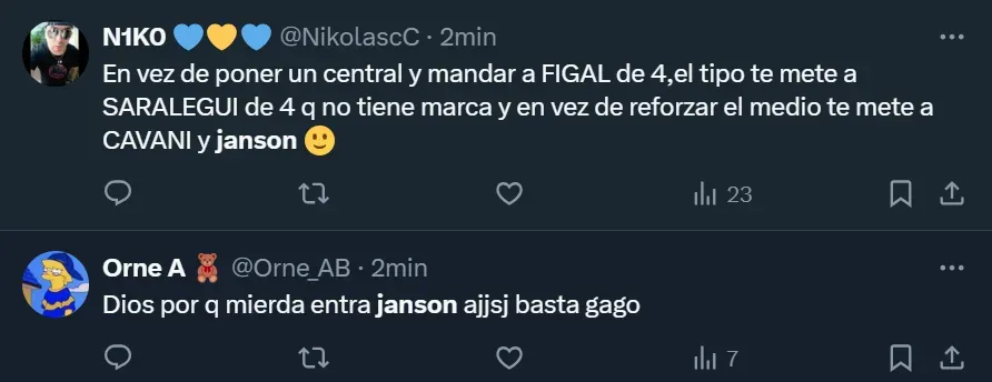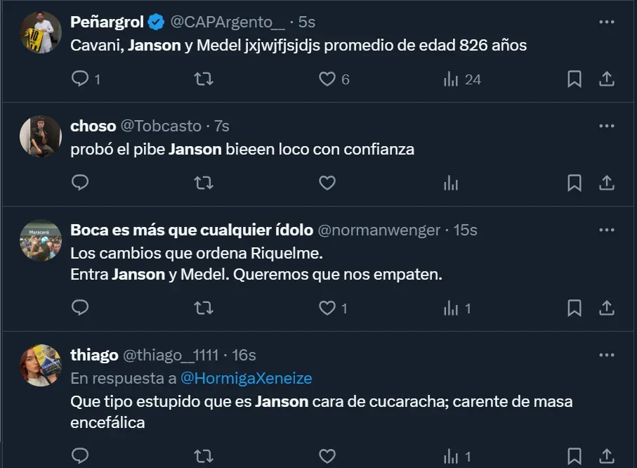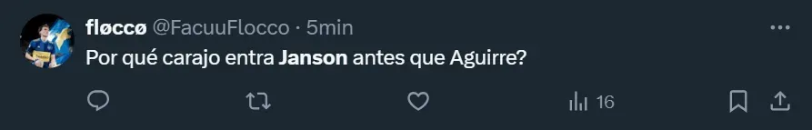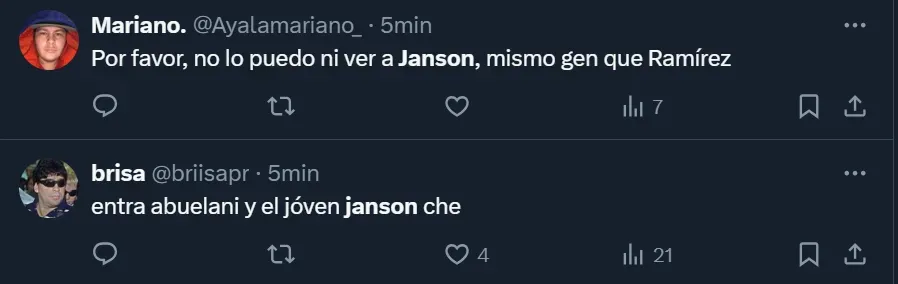 “¿Cómo lo vas a poner a Janson y no a Aguirre?”; “El pibe Janson jugando. Me voy a reír para no llorar” y “Por favor, no lo puedo ni ver a Janson. Mismo gen que Ramírez”, fueron algunos de los tantos comentarios que los hinchas realizaron a través de Twitter, donde el ex atacante de Tigre y Vélez Sarsfield se convirtió en una de las principales tendencias dentro del territorio nacional.