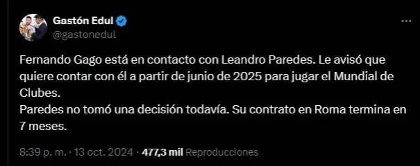 Según informó el periodista Gastón Edul, Fernando Gago está en contacto con Leandro Paredes y le avisó que quiere contar con él en Boca para el 2025. Cabe recordar que el año que viene el Xeneize jugará el Mundial de Clubes de la FIFA.